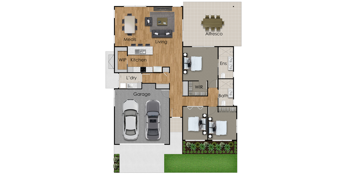 This design boasts three generous rooms, including a master suite with a private ensuite and walk-in robe. The third room is designed as a multipurpose room and can be upgraded to a bedroom with a wardrobe and swing door upon request. In addition, the laundry room has direct access outside, and the double-car garage features built-in storage.